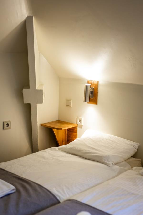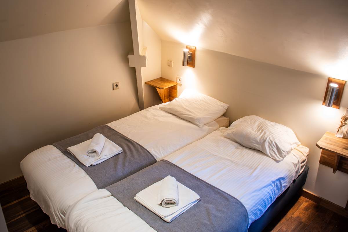 De kamer heeft 2 eenpersoonsbedden (mogelijkheid om 1 tweepersoonsbed op te maken op aanvraag bij boeking), flatscreen-tv en een eigen doucheruimte met douche, wastafel en toilet.
